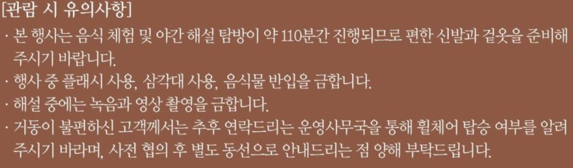 - 티켓 예매 유의사항: 모든 티켓은 사전 예약제로 운영되며, 예매 후 티켓의 양도는 불가합니다.