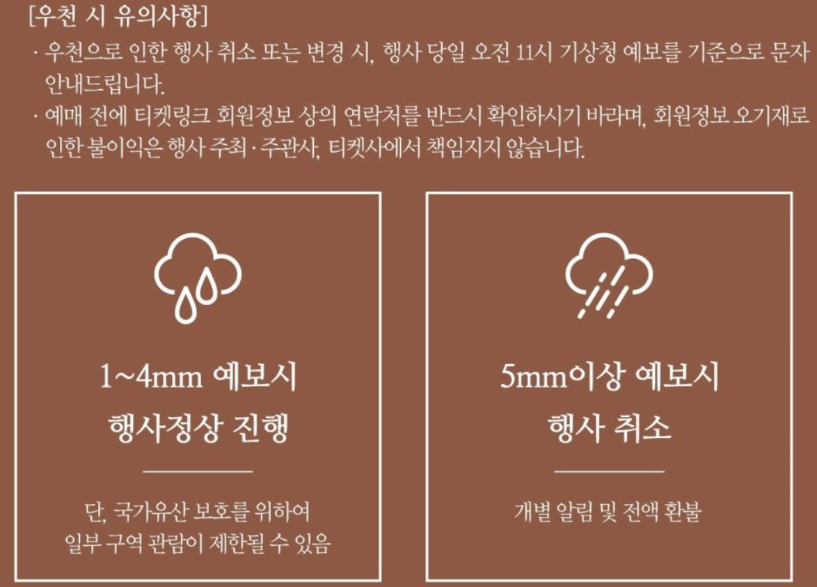 - 우천 시 취소 기준: 행사 당일 오전 11시 기상청 예보 기준으로 5mm 이상의 비가 예보될 경우 행사는 취소되며, 개별 알림과 함께 전액 환불이 이루어집니다.
