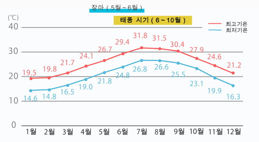 | 여름 (6~8월) | 25~32 | 덥고 습함, 태풍 가능성 | 반팔, 모자, 썬크림 필수 |